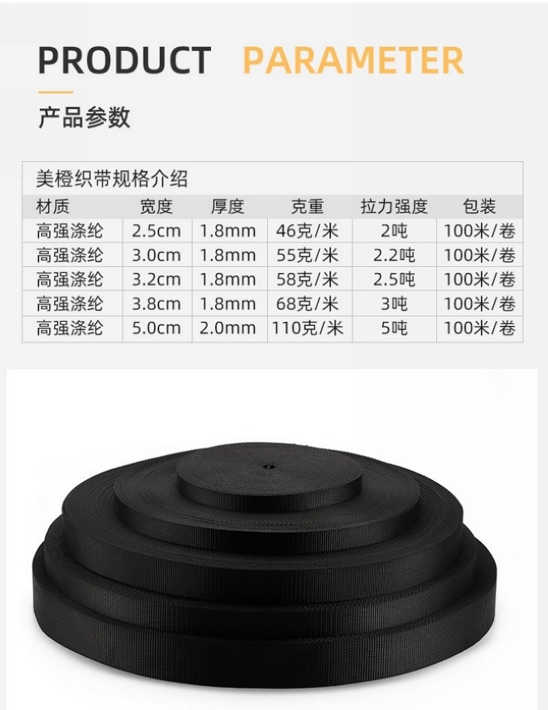 2.5CM 3.8CM 5CM 黑色加厚高強(qiáng)耐老化滌綸織帶快速門捆綁帶。材質(zhì):滌綸 色牢度:水洗3級 干磨4級,拉力強(qiáng)度2噸。手感柔軟,質(zhì)地細(xì)膩,光靚不毛,水洗牢度高。干摩擦度強(qiáng),不褪色,不含偶氮染料,防滑耐磨,拉力強(qiáng)度高。適用范圍:吊環(huán)帶、捆綁帶、體育器材等。
