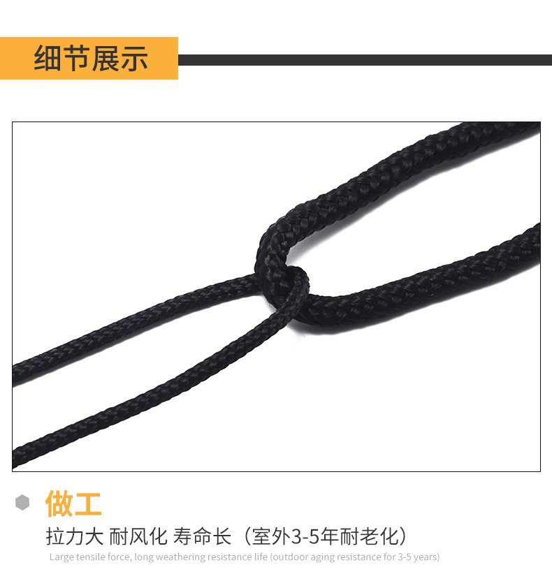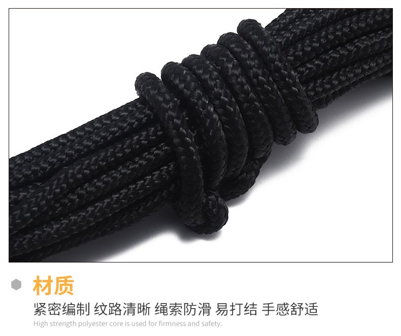 滌綸晾衣繩捆綁繩,耐磨戶外耐曬拉繩尼龍繩子,帳篷編織細(xì)繩旗桿繩。滌綸繩 材質(zhì):滌綸 直徑:2-10mm 拉力強(qiáng)度:100-2000kg 適用范圍:旗桿繩,晾衣繩,帳篷繩,捆綁繩。 緊密編織,紋路清晰,繩索防滑,手感舒適,拉力大耐風(fēng)化壽命長(zhǎng)