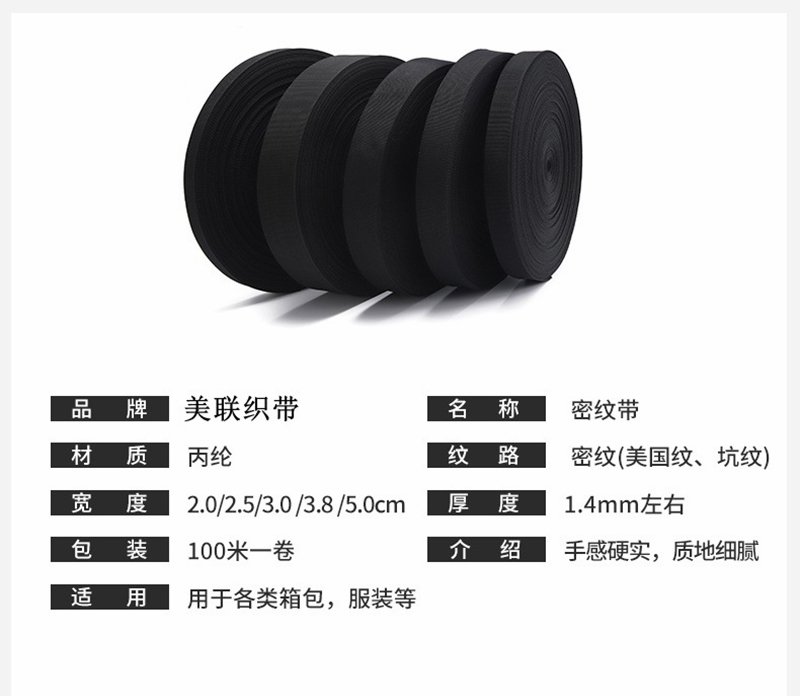 2CM2.5CM3.8CM5CM美國紋丙綸密文帶子,小波浪細(xì)坑紋織帶,丙綸材質(zhì)韌性足加厚耐用,編織緊密,質(zhì)地細(xì)膩平滑抗皺,用于各種箱包服裝等。