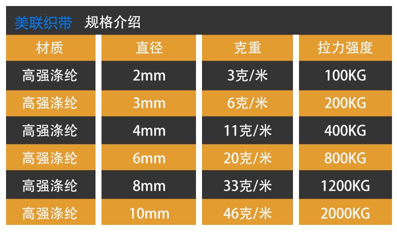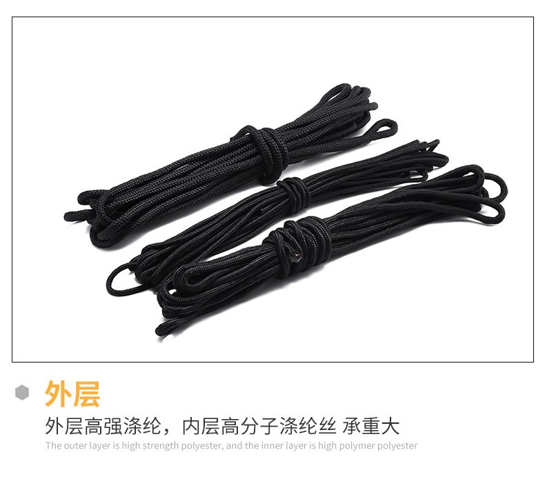 滌綸晾衣繩捆綁繩,耐磨戶外耐曬拉繩尼龍繩子,帳篷編織細(xì)繩旗桿繩。滌綸繩 材質(zhì):滌綸 直徑:2-10mm 拉力強(qiáng)度:100-2000kg 適用范圍:旗桿繩,晾衣繩,帳篷繩,捆綁繩。 緊密編織,紋路清晰,繩索防滑,手感舒適,拉力大耐風(fēng)化壽命長(zhǎng)